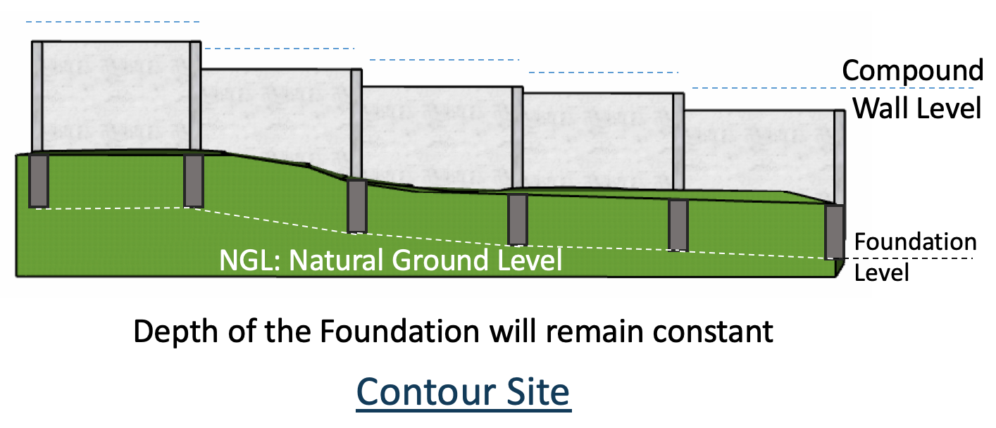 In case if the client wants to maintain a flat level, then there will be filling/cutting of land. In places, where filling is required, soil has to be retained, for which a retaining wall will be required. In such places we will have a retaining wall and compound wall slided into the columns. In majority of the cases, land fill will not be more than 2m.