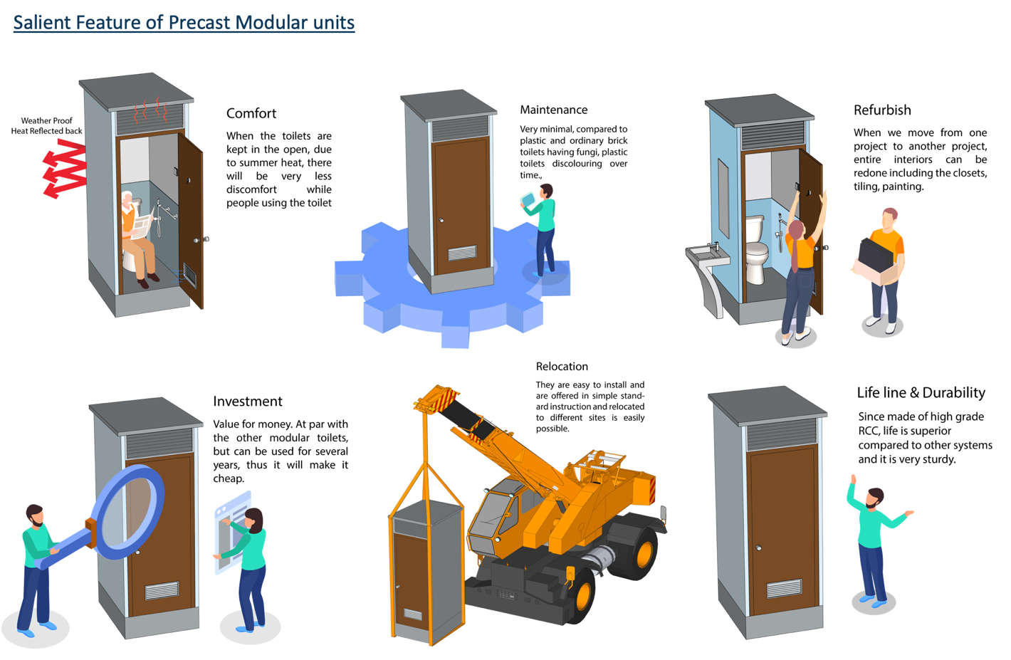 • Cost-effectiveness: Precast RCC toilets can be cost-effective due to reduced labor costs, shorter construction time, and optimized material usage.